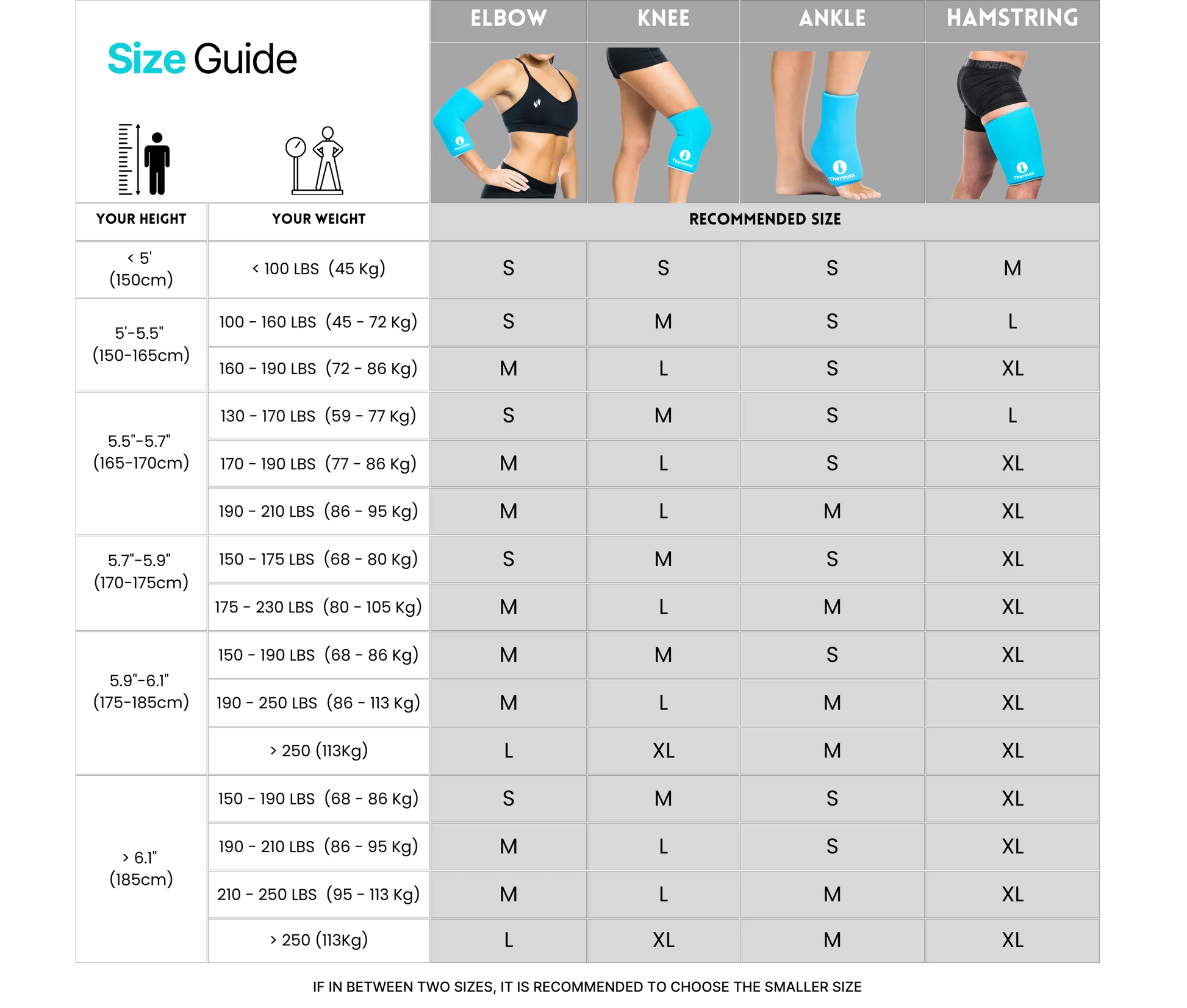 Select your size based on where you’ll wear it (elbow, knee, ankle, hamstring). The fabric’s high stretch keeps sizing forgiving while maintaining a snug, comfortable feel.